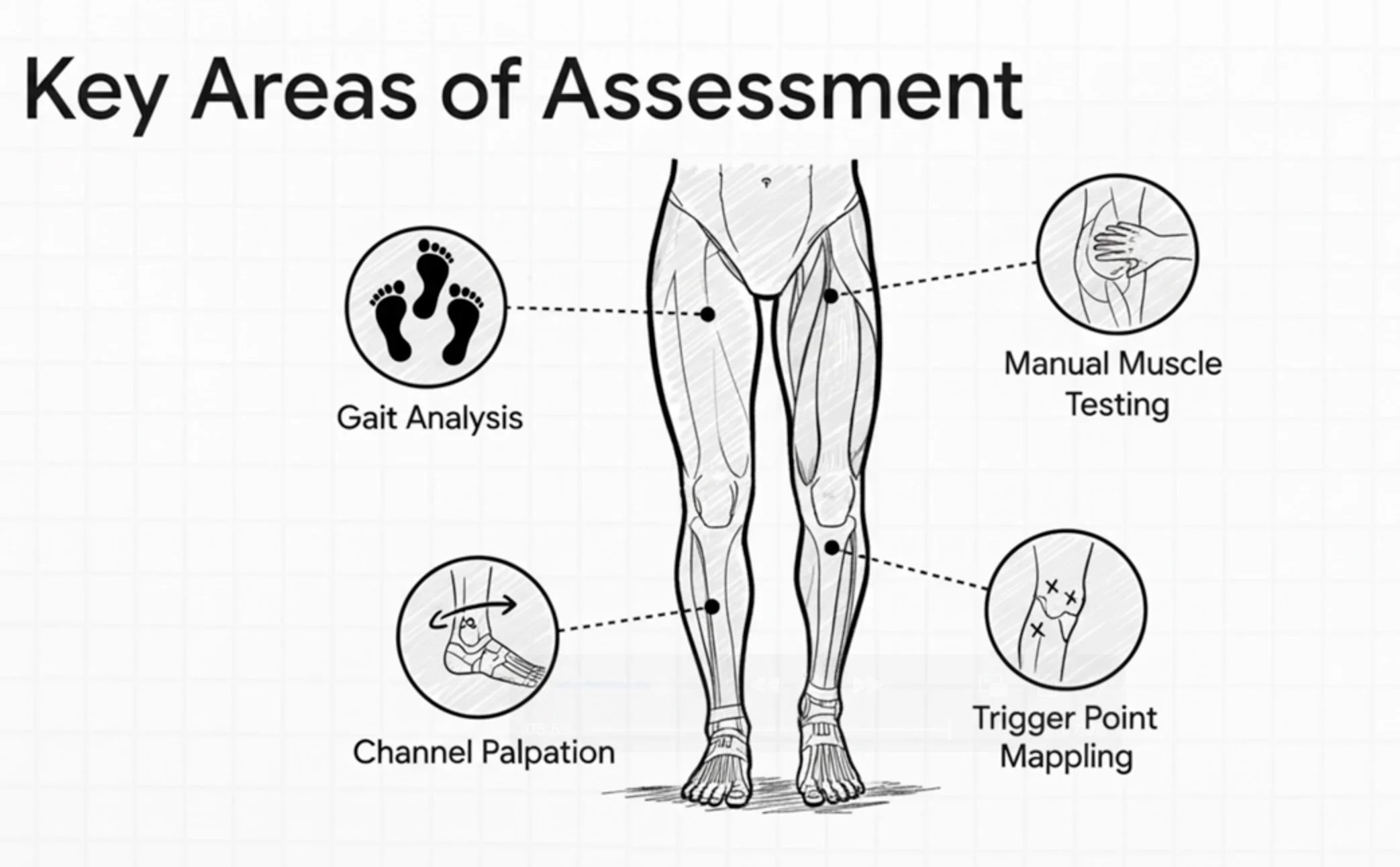 Effective treatment requires comprehensive assessment to find YOUR specific compensation pattern—gait analysis, muscle testing, trigger point mapping, ankle mobility checks, and channel palpation along the entire posterior chain.