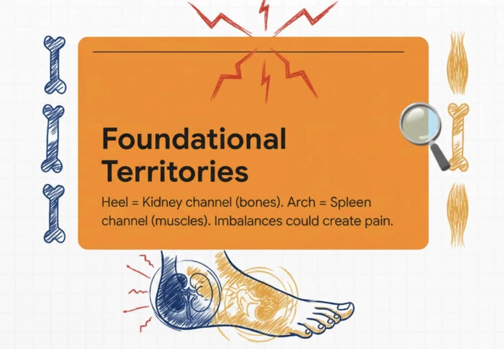 From an Eastern Medicine perspective, the heel is Kidney channel territory. This channel governs our deep constitutional reserves, structural foundation, and bones. Persistent heel pain often points to a deeper issue in the body's foundational mechanics and capacity.